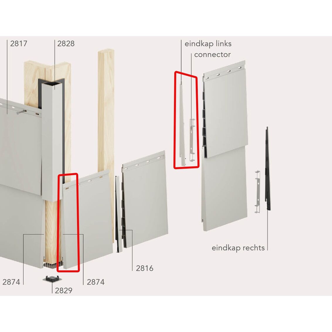 Het Keralit eindkap + connector rechts voor sponningdeel 167 mm zorgt voor een nette, functionele afwerking van het uiteinde van een gevelpaneel. Dit toebehoren sluit naadloos op het paneelprofiel en voorkomt dat vocht en vuil achter de gevelconstructie dringen. Dankzij de prefab passing en het gebruik van identiek materiaal blijft de aansluiting kleur- en vormvast en eenvoudig te verwerken. De connector versterkt de rand en zorgt dat panelen licht en windvast gemonteerd blijven. Montage is snel uitvoerbaar met het standaard bevestigingssysteem, waardoor je montagetijd en faalkosten beperkt.