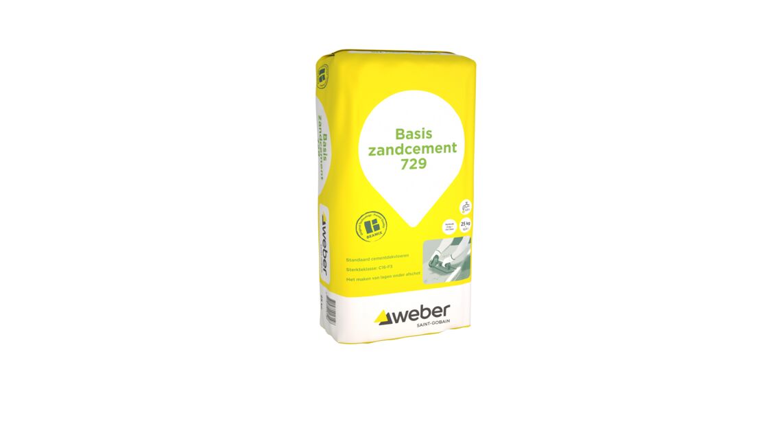 Basis Zandcement 729, is een kant-en-klare zandcementmortel, op basis van NEN-EN 13813, dekvloermortel en dekvloeren. Sterkteklasse: C16-F3. Aan te brengen in laagdikten vanaf 30mm. Is ideaal voor eenvoudige klussen waarbij geen hoge eisen aan de vloer worden gesteld. Voor lichte belasting (o.a. binnenshuis).